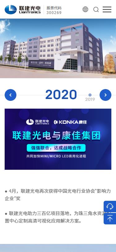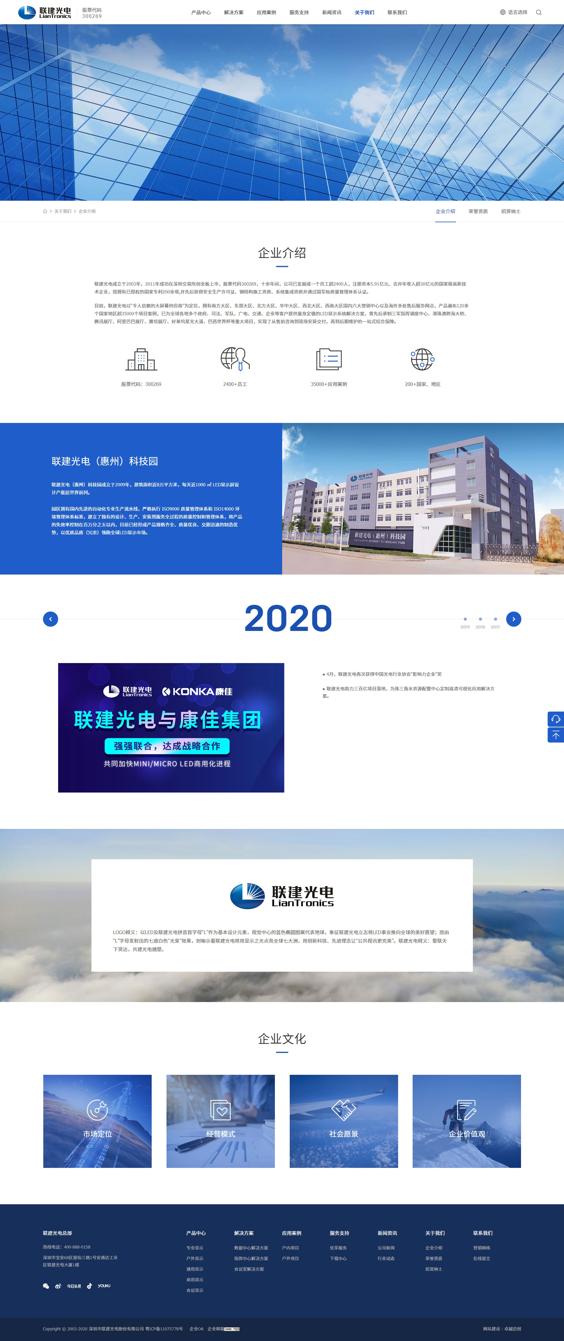 聯建光電成立于2003年,2011年成功在深圳交易所創業板上市,股票代碼300269,十余年間,公司已發展成一個員工超2400人,注冊資本5.91億元、合并年收入超30億元的國家級高新技術企業,現擁有已授權的國家專利200余項,并先后獲得安全生產許可證、鋼結構施工資質、系統集成資質并通過國軍標質量管理體系認證。