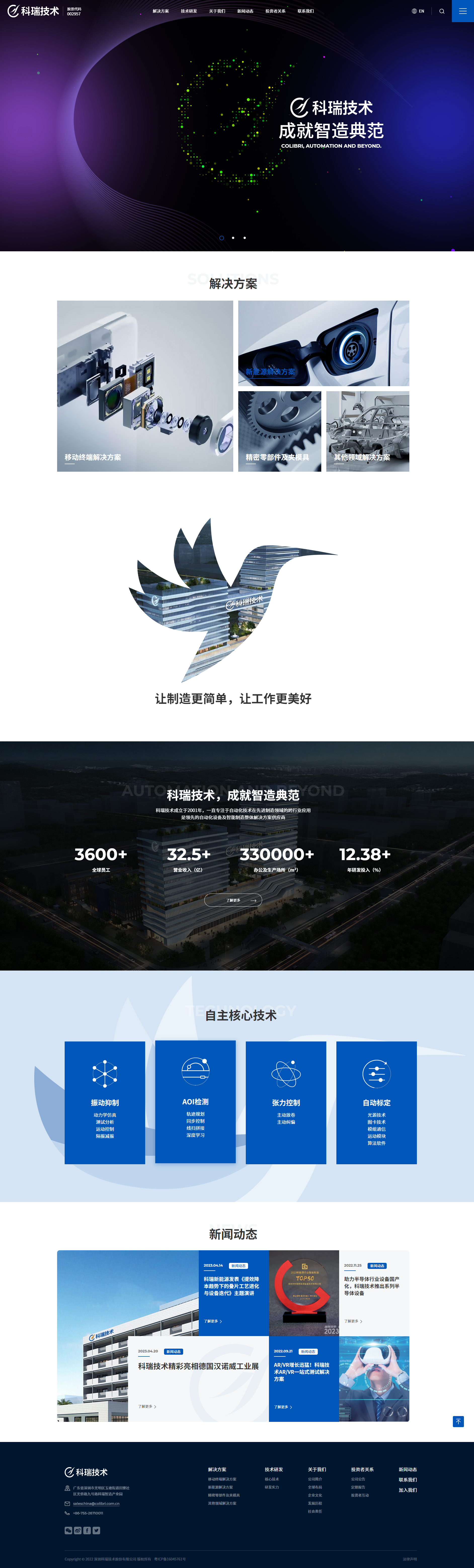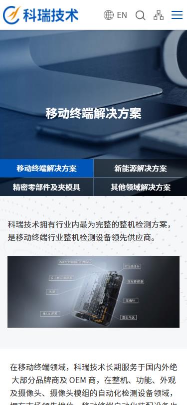 科瑞技術(shù)創(chuàng)立于2001年,是工業(yè)自動化設(shè)備及智能制造整體解決方案的全球供應(yīng)商。網(wǎng)站由網(wǎng)站建設(shè)公司卓越邁創(chuàng)承建,公司主要從事工業(yè)自動化設(shè)備的研發(fā)、設(shè)計(jì)、生產(chǎn)、銷售和技術(shù)服務(wù),以及精密零部件制造業(yè)務(wù)。產(chǎn)品主要包括自動化檢測設(shè)備和自動化裝配設(shè)備、自動化設(shè)備配件、精密零部件。自成立以來,科瑞技術(shù)專注于自動化技術(shù)在先進(jìn)制造領(lǐng)域的跨行業(yè)應(yīng)用。圍繞“3+N”業(yè)務(wù)戰(zhàn)略布局,業(yè)務(wù)主要聚焦于移動終端行業(yè)和新能源行業(yè)。