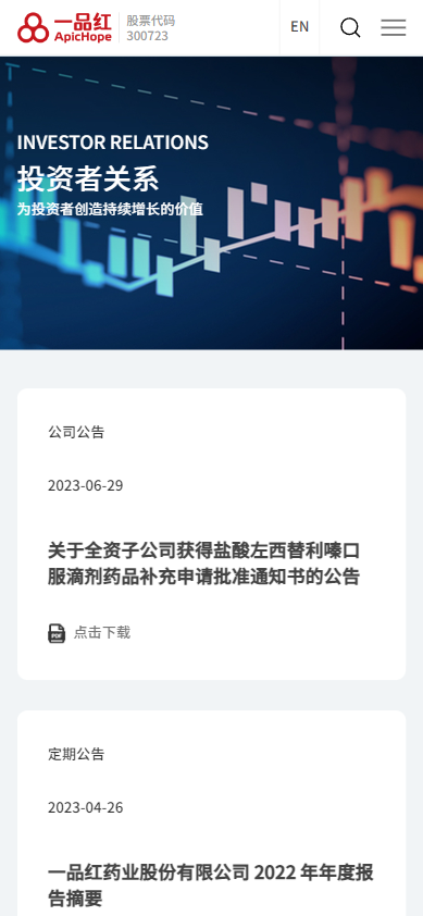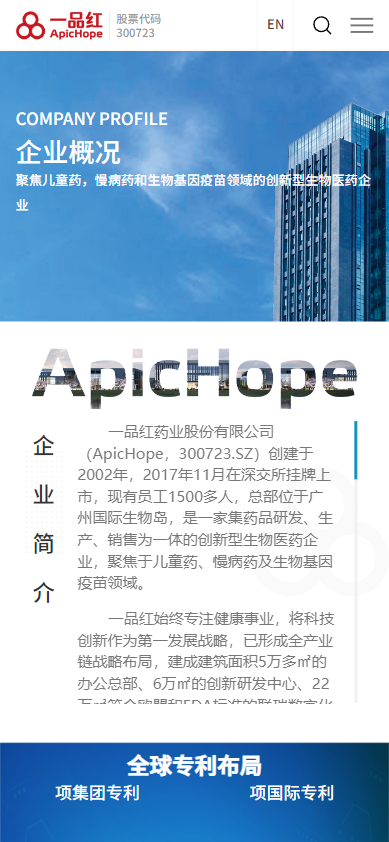 一品紅藥業股份有限公司(ApicHope,300723.SZ)創建于2002年,2017年11月在深交所掛牌上市,現有員工1500多人,總部位于廣州國際生物島,是一家集藥品研發、生產、銷售為一體的創新型生物醫藥企業,聚焦于兒童藥、慢病藥及生物基因疫苗領域。
